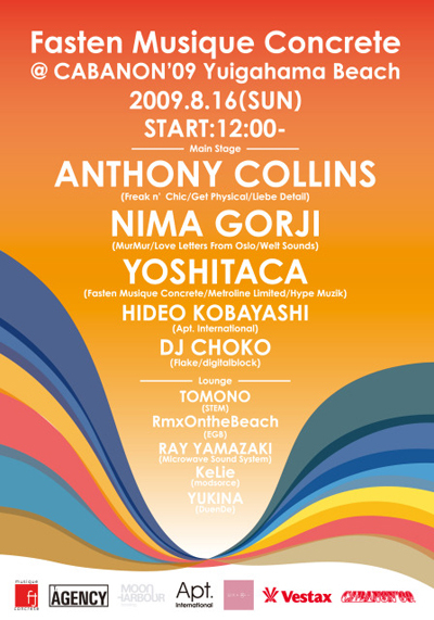 2008年6月、ダンスミュージックの聖地ロンドンで誕生し、東京への展開、そして2009年6月にはスペイン、バルセロナにて行われた世界最大級のフェスティバルSonar weekの一角を担うなど、世界への広がりを見せるFasten Musique Conceteの次なる展開は、ビーチ・パーティーというクラビング・スタイル。Ibizaのトップ・クラブでもレジデントを務めた、今ヨーロッパで最も注目を浴びている二人のDJが、鎌倉 由比ガ浜に登場する。