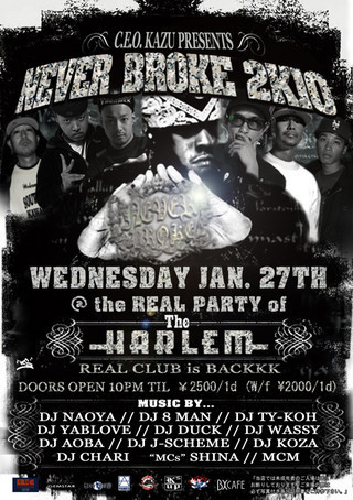 開催終了1/27(WED)NEVER BROKE@HARLEM!!REAL PARTY!!