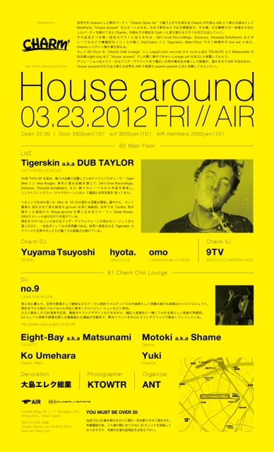 同世代をfutureした野外パーティ’Charm Open Air'で盛り上がりを見せるCharmが代官山AIRにて新たな試みとしてNewParty 'House around' をスタートさせる。今まで野外ならではの雰囲気や、その場、その瞬間での一体感を大切にしたパーティを続けてきたCharm。