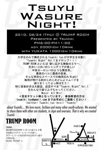 To kick off Summer '10, we are holding a "Tsuyu Wasure Night!" at TRUMP ROOM in Shibuya, the venue for countless celebrity birthdays as well as the recent Black Eyed Peas album release party. *YUKATAs are the recomended dress code. For Uni. Students only.