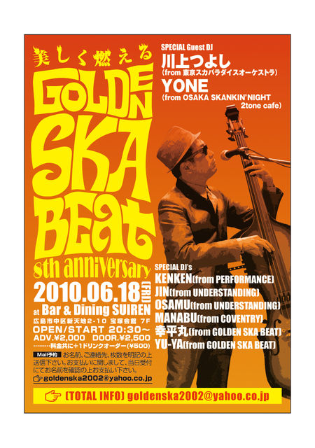 今回お届けする気になるイベントの内容とは、スペシャルゲストDJに日本、いや世界が誇る大御所バンド、東京スカパラダイスオーケストラから川上つよし氏、大阪から、今年で14年目に突入した浪花のSKAパーティーOSAKA SKANKIN'NIGHTのDJ YONE氏の豪華アーティストお二方を迎え、なんとも8周年にふさわしいイベントが決定!! 天井知らずの盛り上がり! 今年もGOLDEN SKA BEATから目が離せない。