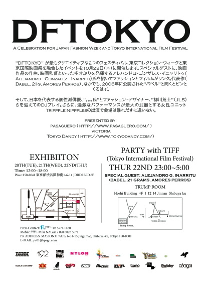 DFTOKYO brings together two of the biggest creative festivals in town, Japan Fashion Week and Tokyo International Film Festival with an exhibition showcasing some of the most outstanding designers from Mexico and an after party with some very special guests as world renowned Mexican Director Alejandro Gonzales Inarritu (Babel, 21Grams, Amores Perros), *secret actor from japan* and fashion designer Arashi Yanagawa and the unpredictable live performance of Trippple Nippples.