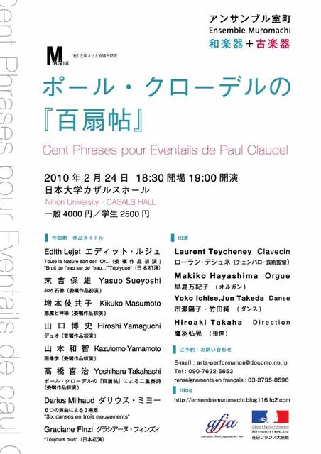 Recueil de très exactement cent-cinquante poésies courtes en forme de Haikai , "Cent Phrases pour Éventails" fut compose vers 1926 , au pays du Soleil Levant et avec la collaboration de peintres-calligraphes nippons, par l'un des écrivains français les plus passionnés du Japon où il vecut d'ailleurs à plusieurs reprises : Paul Claudel ( 1868-1955 ). Cette oeuvre littéraire d'une grâce infinie est à l'origine du Spectacle que nous vous proposons ici, divise en deux parties : l'une consacree au duo instrumental "Clavecin + Orgue" qui fait suite a la série de concerts "Clavecin+ (Japon I / Harpe II / Percussion III ), l'autre à l'Ensemble Muromachi et à ses experimentations sonores "pluri-civilisationnelles" inouies, en un spectacle unissant Signe/Musique/Danse au Passe/Présent/Futur. Compositeurs, interprètes, artistes et autres militants conscients de l'importance du rôle de l'Art dans nos sociétés, nous nous faisons tous un réel Bonheur de partager avec vous cette soirée d'hommage à la créativité humaine en perpetuel devenir.