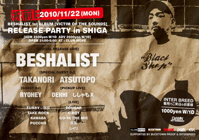 京都を代表するアーティストBESHALISTが9月15日に 1st ALBUM 「VICTIM OF THE SOUNDS」をリリースしたのを記念して来る11月22日(月)祝前日に滋賀のCLUB MOVEにてRELEASE PARTY in SHIGAの開催が決定!!! 共演陣はSPECIAL GUEST DJにレペゼン滋賀「SHIKI RECORDS」からDJ TAKANORI、京都から盟友ATSUTOPO(DJ ATSUHIKO,DJ TOPPO)、GUEST DJに京都で今や若手NO.1の実力との呼び声の高いDJ RYOHEYさらにPICK UP LIVEに滋賀、京都で大活躍中のししゃもX,DEHHIという豪華布陣でお贈りします!!