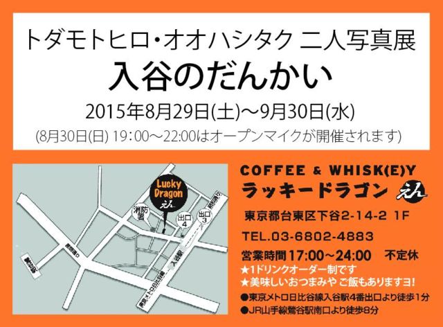 先日もお伝えしました、毎年恒例の、ギャラリーバー「ラッキードラゴンえん」さんでの写真展ですが、今年は畏友トダ モトヒロさんと二人展『入谷のだんかい』を開催できることになりました。