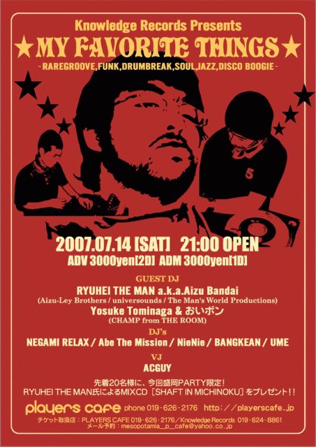 ◎RYUHEI THE MAN a.k.a. Aizu Bandai (Aizu-Ley Brothers / universounds / The Man's World Productions) -------------------------------------------------------- 90年代半ばよりレコード収集、執筆、DJを中心とした音楽活動を始める。 ジャンルを超えた幅広い選曲と安定したプレイには定評があり、 現在最も黒いグルーヴを生み出すDJの一人としてファンの絶大な支持を得ている。 2003年発売されたDJ SHADOW『THE PRIVATE REPRESS』において日本人代表の一人 としてイントロに参加、また2004年、2005年とKEB DARGE AND DJ SHADOWによる 「DEEP FUNK JAPAN TOUR」にも参加。