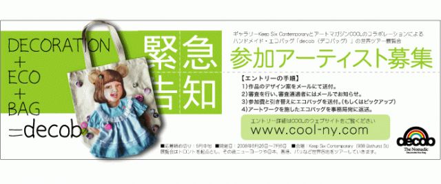 = 巡回展 ========================= 【第1ステージ】トロント(カナダ) The Nomadic “decob” 1st Stage in Toronto 募集テーマ:エコアート 会場:Keep Six Contemporary(トロント、カナダ) 入場料:無料 期間:2008年6月26日〜7月6日(10日間) オープニングレセプション 6月26日(木)6時〜10時(予定)