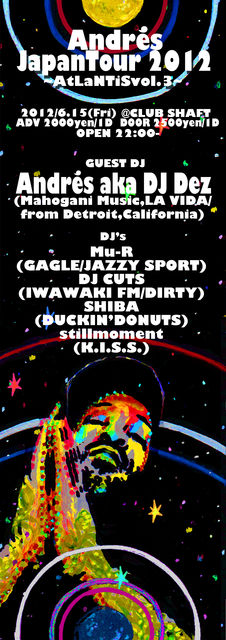 ■Andrés aka DJ Dez ( Mahogani Music, LA VIDA/ from Detroit, California ) MoodymannのレーベルKDJやMahogani Music、Underground Resistance傘下のレーベルHipnotechからのリリース等で知られる、デトロイトのプロデューサー/ DJ。 ラテン〜ジャズミュージシャンである父、Humberto ”Nengue” Hernandezからアフロキューバンリズムを継承し、Moodymann Live Bandのツアーに参加したり、Erykah Baduの作品 “Didn’t Cha Know”(produced by Jay Dilla)ではパーカッショニストとして参加している。今までにMahogani Musicから『Andrés』(2003年)、『Andrés �鵺 』(2009年)、『Andrés �鶚』(2011年)の3枚のアルバムを発表している。また2012年には自身のレコードレーベル【LA VIDA】を始動し、レーベル第1弾としてAndrés本人による12inch「New For U」をリリースしている。 DJ Dezという名前でも活動しており、デトロイトのHip HopチームSlum Villageのアルバム「Trinity」や「Dirty District」ではスクラッチを担当し、Slum VillageのツアーではライブDJとしても活躍。 DJプレイもパーティーグルーヴに溢れたパフォーマンスが好評で、Los Angelesの名物パーティーDo-Overにも参加。今年3月にLondon Fabricにて行われたUK最重要レーベルEglo Recordsの3rd Anniversary PartyにもゲストDJとして招かれている。