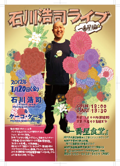 石川浩司さん(パスカルズ ホルモン鉄道 exたま)と私(アコーディオン)が参加しているバンド「ケーコ・ケーキ」のライブが神戸の新開地であります!