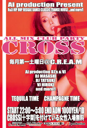 『CROSS』(十字架)のアクセサリーを付けている女性は入場無料だから いつもよりもっとオシャレに!SEXYに!よりキュートに! オシャレな女の子の為の CLUB PARTY!! 早い時間からALL TIME 各ジャンルのヒットナンバーで盛り上げるので誰でも楽しめる事間違いなし!! もちろんあります!無料開放!!大好評テキーラタイム!!シャンパンタイム!! 毎回サプライズなゲストや演出がある!かも!? 毎月第一土曜日は、Ai production Presents『ALL MIX CLUB PARTY〜CROSS〜』@C.R.E.A.Mで!!