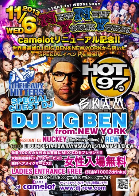 11.6(水)毎回満員御礼の毎月第1水曜日"NYNY@渋谷camelot"女性は入場無料!!本場NewYorkから世界トップクラスのDJ BIG BEN(HOT 97)を迎えたcamelotリニューアルSPECIALはビッグパーティーになる事間違いなし!! ☆camelotを代表するイベント"NYNY"は女性実質入場無料で毎回満員御礼!! ☆KANYE WEST,LIL'JONと肩を並べる世界最高峰のDJ BIG BENが NYから来日!! ☆CDプレゼント,ヘアメイク,カメラスナップなど女性に特典満載!!