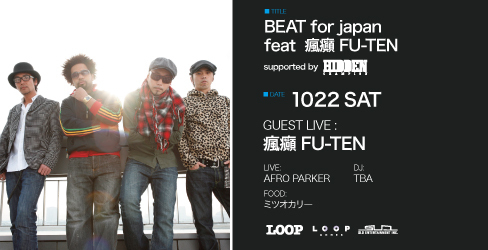 2011.10.22 [sat] BEAT for japan feat 瘋癲 FU-TEN supported by HIDDEN CHAMPION GUEST LIVE: 瘋癲 FU-TEN LIVE AFRO PARKER and more... DJ TBA FOOD ミツオカリー OPEN 24:00 DOOR : \2,500 w/f : \2,000 【Twitter @ballo_ballo_mid のフォロー画面で\2,000】