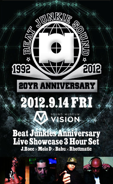 90年代ヒップホップ・シーンの中で、Invisibl Skratch Piklz、X-Ecutionersなどと共にターンテーブリズムの頂点を極めたウェストコーストを代表するターンテーブリスト・クルー、The Beat Junkies、またの名を“The World Famous Beat Junkies”。その中心メンバーであるJ.Rocc、Babu、Rhettmatic、Melo Dが、約10年ぶりに4人全員が揃って来日を果たす。今年、結成20周年を迎えた彼らは、6月末にLAにて記念イベント『The Beat Junkies 20 Year Anniversary』を開催。そのショウでも大反響となった4人でのチームルーティンの他、今回の来日ツアーではそれぞれのソロ・プレイやデュオでのセッションも展開する。DJ BAKUやDJ KOCO a.k.a. SHIMOKITAなど、国内の実力派DJも駆けつけるこの日。The Beat Junkiesの20年間の軌跡が再現されるとともに、また新たな奇跡が誕生する。