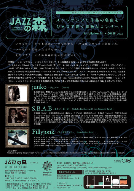「空間アート」と「ジブリ」と「ジャズ」の素敵なコラボレーションがここ名古屋に実現します! アートユニット「Fillyjonk(フィリフヨンカ)」により、「森」をテーマとしたインスタレーションアート(空間アート)で創り上げられるコンサート会場。360度をこのアートで囲み、まるで森の中に迷い込んでしまったような幻想的な空間が創り出されます。そしてそこから聴こえてくるのはジブリミュージックの名曲の数々をアレンジしたアコースティックジャズサウンド。このイベントの音楽面をプロデュースするのは、名古屋老舗ジャズライブハウスでも勢力的に活動し、今最も注目される若手ジャズボーカリスト“junko”と、 そのすべての楽曲をアレンジし、アメリカ帰りの実力確かなジャズギタリスト“砂掛康浩”率いる“S.B.A.B”こと“Sakake Brothers with the Acoustic Band”。「風の谷のナウシカ」〜「天空の城ラピュタ」「魔女の宅急便」「もののけ姫」などスタジオジブリ作品の名曲が「ジャズ」になって登場します!「空間アート」と「ジブリミュージック」と「ジャズ」がリンクする素敵な世界、「JAZZの森」。ぜひ芸術の秋に日常から少し離れたこの「森」を体感してください。