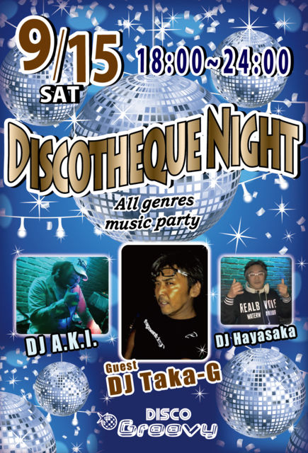 【9月15日(土)】第3土曜日の今夜は! DJ A.K.I. によるディスコDJならではの MC&PLAY で盛上げるイベント【DISCOTHEQUE NIGHT】Guest DJ TAKA-G & DJ Hayasaka と共に横浜のサタデーナイトを盛り上げます♪