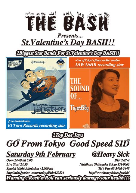 Date...Saturday 9th February Open...24:00 till 5:00 Live start...24:30 Special night admission...2,000yen Bands..CC Jerome's Jetsetters(from Netherlands) & Tigerlily(One of Tokyo's finest rockin' combo)