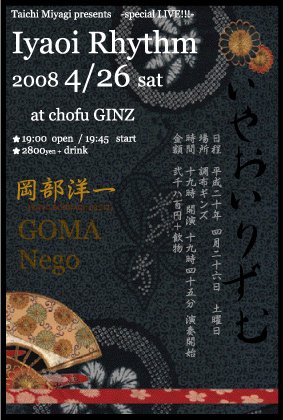 GOMA オーストラリア世界最古の木管楽器、邦人ディジュリドゥー・プレイヤーの第一人者。 98年、オーストラリアのディジュリドゥー大会で、非先住民としては初の表彰を受け、一躍注目を集める。 以来、オーストラリア、ロンドン、日本と活動の拠点を移しながら、常に斬新に表現の場を拡げてゆく。 昨年は、オーストラリアツアー、W杯サッカー開催に向け日本代表中田英寿監修のコンピレーションアルバムに参加、バンドNIGHT JUNGLE「Jungle Cruise」のリリース、さらにBill Lazwell、Karsh kaleらとアルバム「SOUL OF RITE」を発表。 昨年は、GOMA&Jungle Rhythm Section「RHYTHM & BREATH」をリリース、 FUJI Rock Festivalに参加。