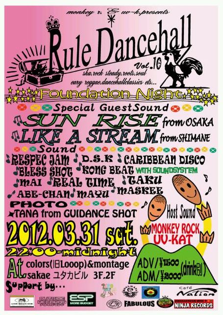 <SPECIAL GUEST SOUND> SUN RISE from OSAKA LIKE A STREAM from SHIMANE <SOUND> RESPEC JAM D.S.K CARIBBEAN DISCO BLESS SHOT KONG BEAT with SOUND SYSTEM MAI REAL TIME TAKU ABE-CHAN MAYU MASKEE