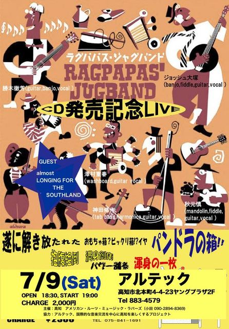高知のブルーグラス・バンド「Longing For The Southland」です。 気がつけば7月。一年も半分過ぎてしまいました。さて来週末、7月9日(土)神戸のラグパパス・ジャグバンドがCD発売記念ライブを行います。 空き缶やプラスチック製の空きビン、トイレットペーパーの芯などを使って、風変わりな楽器を作る手作り楽器教室と、それらを使った手作り楽器演奏会や音楽会活動のほか、NHK教育テレビや幼児指導雑誌に登場するなど、園児のアイドルとして全国で大人気の「さわむらしげはる」氏を擁する「ラグパパス・ジャグバンド」。 「ジャグ」とはウイスキーなどの飲み物を貯蔵するための瓶。ジャグは、口に息を吹き込むことによって、低音楽器として使用されます。ジャグのほか、洗濯板、ノコギリ、カズー、ウォッシュタブ・ベース(洗濯桶とモップから作ったベース)、スプーンなど、身の回りにあるものから作られた手製の楽器を多く使うのが特徴。これらの楽器にハーモニカ、バンジョー、ギター、マンドリンなどの楽器が加わって、演奏曲には、トラディショナルなジャズ、ブルース、カントリーから歌謡曲、オリジナルまで。