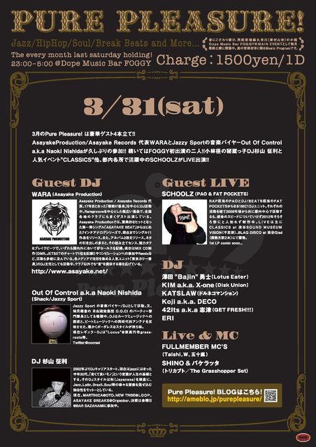 3月のPure Pleasure!は豪華ゲスト4本立て!! AsayakeProduction/Asayake Records 代表WARAとJazzy Sportの音楽バイヤーOut Of Control a.k.a Naoki Nishidaが久しぶりの参加!!続いてはFOGGY初出演の二人!!小林径の秘蔵っ子DJ杉山 征利と人気イベント"CLASSICS"他、都内各所で活躍中のSCHOOLZがLIVE出演!!