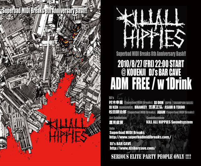 Superbad MIDI Breaks結成8周年を記念してのフリーパーティー開催! 場所は高円寺に昨年OPENしたばかりの DJ's BAR CAVE with 5800W KILL ALL HIPPIES SOUNDSYSTEM。 22:00 START なんと入場無料 with 1ドリンク 再入場可。 オタクくさいハードコアパーティに挑戦状を叩きつける東京屈指のリアルハードコアパーティー!!
