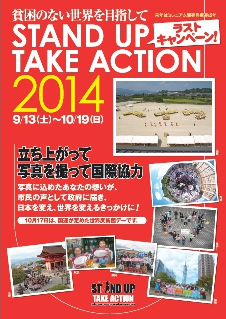 ●スタンド・アップとは? STAND UP TAKE ACTION(以下スタンド・アップ)は、貧困解決のための世界的なキャンペーンです。 スタンド・アップは、2000年に189ヵ国のリーダーたちが合意したミレニアム開発目標(MDGs)達成を後押しするために実施されています。 このMDGsとは、2015年の期限までに8つの分野において具体的な目標達成を掲げた開発目標です。例えば、「世界の貧困人口を半減する」「5歳未満児の死亡率を3分の1にする」など、8分野で21のターゲットが定められています。 スタンド・アップのキャンペーンでは、MDGs達成に向けて人々の力を集めるため2006年から毎年、世界反貧困デー(10月17日)前後に貧困解決を求める意志を示すために「立ち上がり」(STAND UP)、「行動する」(TAKE ACTION)ことを呼びかけ、その様子を収めた写真を集めて1つの「声」をつくる活動を行ってきました。それを日本では「動く→動かす」が集計し、日本の政府、政治家、省庁などに届け、貧困解決とMDGs達成に向けた取り組みを政府に求めてきました。そして民間の組織や市民に対しても、身近なできることから何か実践をするよう呼びかけています。 2009年には世界各地で1億7000万人以上がこのキャンペーンに参加しギネス記録を打ち立てました。2013年は日本全国で3万2600人が立ち上がりました。学校で、オフィスで、公園で、行動の場所は問いません。年に1回のキャンペーンに、あなたも参加しませんか。