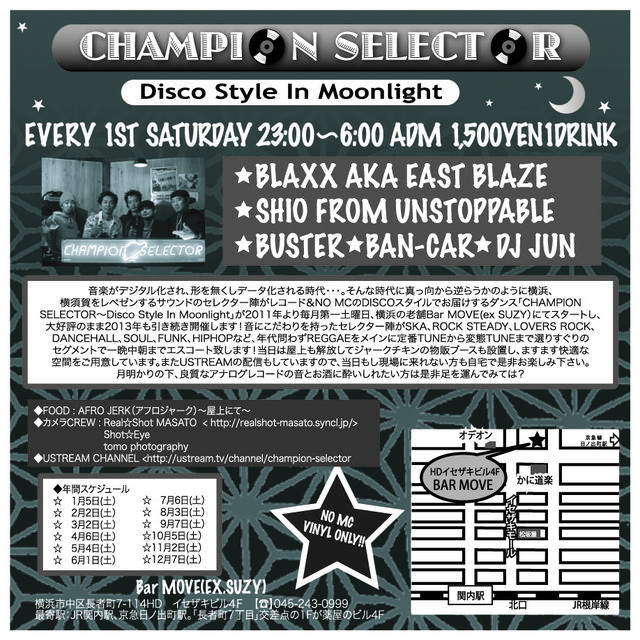 音楽がデジタル化され、形を無くしデータ化される現代。そんな時代に真っ向から逆らうかのように横浜、横須賀をレペゼンするサウンドのセレクター陣がレコード & NO MCのDISCOスタイルでお届けするダンス「CHAMPION SELECTOR〜DISCO STYLE IN THE MOONLIGHT〜」が横浜の老舗、BAR MOVE(EX SUZY)にて2011年よりスタート。