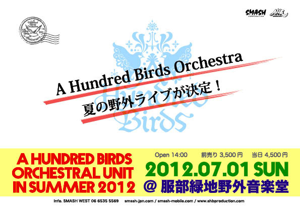 今回の"A Hundred Birds Orchestral Unit In Summer 2012"は年に1度だけ行われるクリスマスオーケストラの夏番外編! AHBオーケストラオープンエアーライブ in Summer 服部緑地野外音楽堂。皆さんお楽しみ下さい。