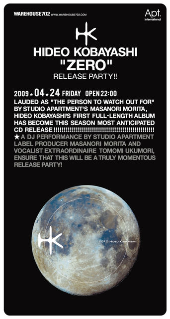 STUDIO APARTMENTの森田昌典をして「今、一番注目している人」と言わしめ、DEFECTEDのオーナーSIMON DUNMOREもその才能に惚れ込んだ、ヨーロッパで最も注目されている日本人ハウスプロデューサーHIDEO KOBAYASHIの1stフルアルバム「ZERO」の、東京でのリリースパーティーがついに開催決定!!