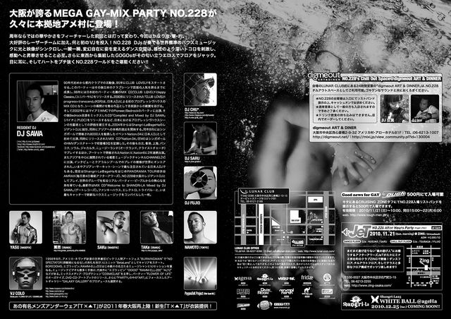 --------------------------------------- ●NO.228’s Chill Out Space @digmeout ART & DINNER 会場のLUNAR CLUB前にある24時間営業の「digmeout ART & DINNER」は、NO.228チルアウトスペースとしてご利用可能。DJ豆葉&korによるゴキゲンなサウンドと共におくろぎください。 [ご利用に際して] ※NO.228のお客様は入口にてリストバンド提示の上、キャッシュオンでお求めください。 ※通常営業として一般の方も入店されますので予めご了承ください。 ※ドリンク飲食の持ち込みはできません。店内でオーダーしてください。