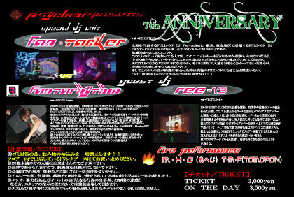 北陸を代表するFULL-ON DJ Psy-tackerと、東京、東海地区で活躍するFULL-ON DJ FANTARHYTHMとの合体、それが『FAN-TACKER』である。 急遽決まったこのユニット。この2人のPLAYを知ってる人でも、このユニットが一体どうなるのか想像も出来ないだろう。 上手く噛合うのか、いや十分にスキルのある2人だからしっかりと噛み合わせてくるのか。 BATTLEのようなVERSUSになるのか、それはまだ本人達もおそらく分かってないだろうが、間違いなく楽しませてくれるだろう♪ そしてこの2人の音が綺麗に噛合った時は究極のFILL-ONになることは間違いない。 この一夜限りのスペシャルユニットは見逃せない!!