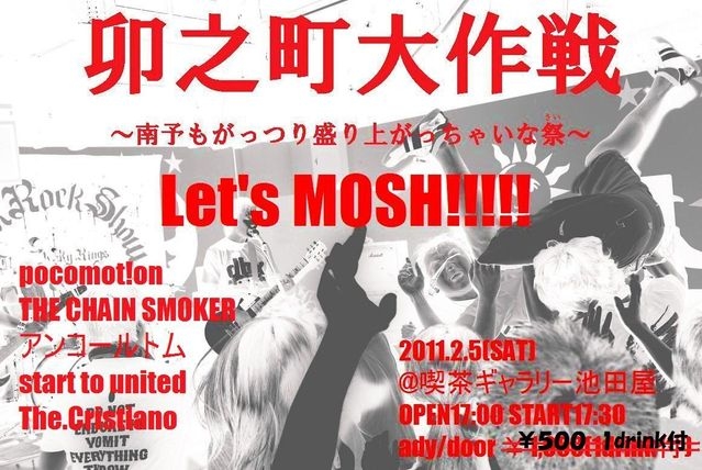 ACIDMAN・ANTI×SOCIAL×STUDENT・B-DASH・THE BOWDIES・BEAT CRUSADERS・BIG MAMA・BUZZ THE BEARS・dustbox・EGG BRAIN・ELLEGARDEN・FOUR GET ME A NOTS・GOOD 4 NOTHING・Hi-STANDARD・THE HIGH-LOWS・HOT SQUALL・inncent・Ken Yokoyama・locofrank・NICOTINE・Northern19・pocomot!on←・RIZE・RONDON RATS・SERVIS ACE・SORRY FOR A FROG・SpecialThanks・STANCE PUNKS・Yacht.・アンコ-ルトム・ガガガSP・チャットモンチ-・マキシマムザホルモン・銀杏BOYZ・四星球・怒髪天・10-FEET等々… ↑こういった音楽に興味のある方! こういった音楽に興味ない方! ライブハウスが好きな方! ライブハウスに行ってみたい方! モッシュやダイブをしてみたい方! 何かよくわかんないけど暇だって方! 毎日つまんないなと思ってる方! 南予って遊ぶところないな…て思ってる方!