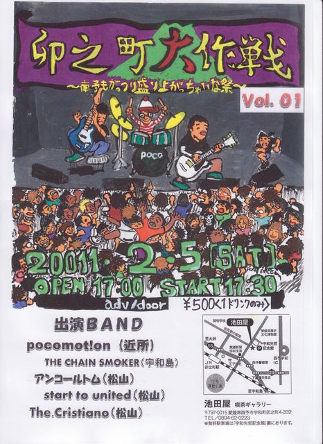 出演BAND ◎ THE CHEIN SMOKER(宇和島) ◎ アンコールトム(松山) ◎ start to united(松山) ◎ pocomot!on(西予市) ◎ THE Cristiano(松山)