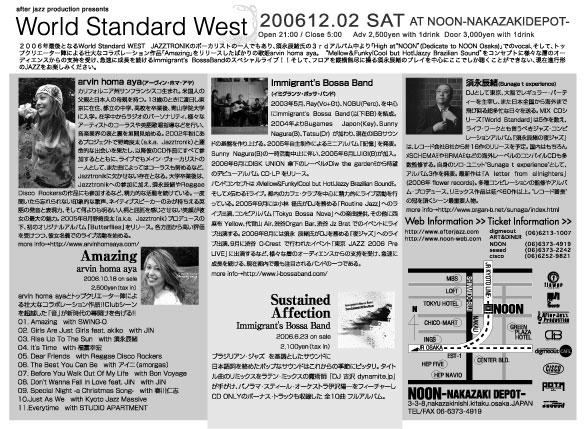 2006年最後となるWorld Standard WEST JAZZTRONIKのボーカリストの一人でもあり、須永辰緒氏の3rdアルバム中より「High at“NOON”(Dedicate to NOON Osaka)」でのvocal、そして、トップクリエーター陣による壮大なコラボレーション作品「Amazing」をリリースしたばかりの歌姫arvin homa aya。