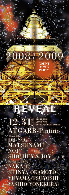 2008.12.31(web) REVEAL presents 2008 to 2009 in Front of Tokyo Tower Countdown Party 22:00 start door/4000yen with flyer/3500yen Venue:Garb Pintino [http://www.garb94.com/pintino/]