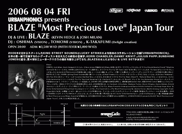 2006.08.04(FRI) URBANPHONICS presents BLAZE "MOST PRECIOUS LOVE" JAPAN TOUR DJ & LIVE : BLAZE(KEVIN HEDGE & JOSH MILAN) DJ : OSHIMA(VISION),TOMOMI(VISION),K-TAKAFUMI(Delight creation) OPEN 20:00- ADM. 3,500YEN/W1D WITH FLYER. 3,000YEN/W1D PLACE : GRAND Cafe(06-6213-8637) http://www.grandcafeosaka.com