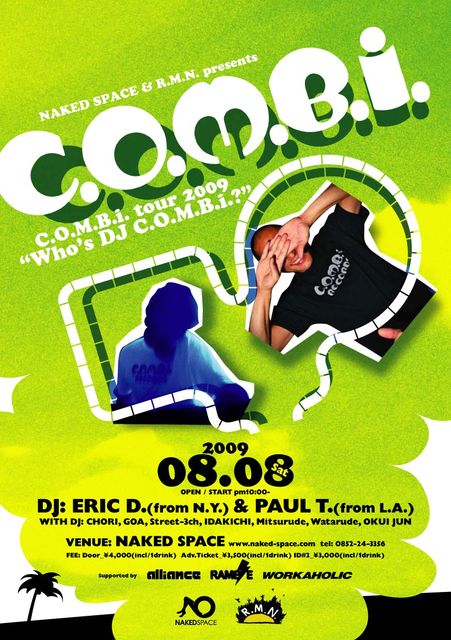 2009.08.08.Sat 22:00〜 「 NAKED SPACE & R.M.N. presents C.O.M.B.i. tour 2009 " Who's DJ C.O.M.B.i. ? " 」 DJ : ERIC D.(from N.Y.)& PAUL T.(from L.A.) WITH DJ : EZ(TILT), CHORI, GOA, STREET-3CH and IDAKICHI, Mitsurude, Watarude, OKUI JUN VENUE: NAKED SPACE (http://www.naked-space.com/access.html) http://mixi.jp/view_community.pl?id=634874 FEE: Door_\4,000(incl/1drink) Avd.Ticket_ \3,500(incl/1drink) NAKED ID#2_\3,000(incl/1drink)