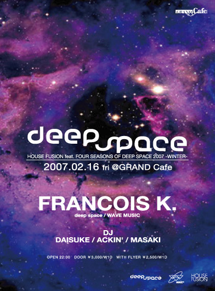 2007.02.16(FRI) FOUR SEASONS OF DEEP SPACE 2007 -WINTER- feat. HOUSE FUSION DJ:FRANCOIS K.(deep space/WAVE MUSIC) DAISUKE,ACKIN',MASAKI DANCE & HOST: DETOX,Jahgistylee,Maya,Tsune,K-C,yemAya,Bun,Hiro,Yukari,Naomi K.,Futosuke OPEN 22:00- DOOR 3,000YEN/W1D WITH FLYER 2,500YEN/W1D PLACE GRAND Cafe 06-6213-8637 You must be 20 & over with ID. 20歳未満の方はご入場できません。御入場時に写真付き身分証明証を掲示して頂きます。