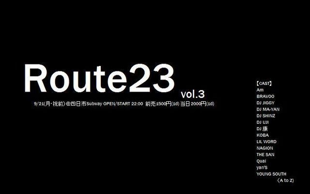 『Route23 Vol.3』 9/21(月・祝前)@四日市Subway OPEN/START 22:00 前売:1500円(1d)、当日:2000円(1d) 【CAST】(A to Z) Am bravoo(BB9) DJ JIGGY DJ MA-YAN DJ SHINZ DJ UJI(魂Sound factory,音韻王者Rec) DJ 康(THE SAN) KOBA LIL WORD NAGION THE SAN Quai yan'S YOUNG SOUTH