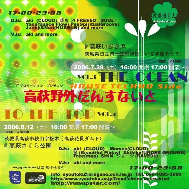 ○HOUSE SIDE 17:00〜23:00 DJs:aki (CLOUD) Momen(CLOUD) 勉(Beautiful Fliday) Akihiko(UNDER GROUND) Free(map) SHIN ショージ(RAVE01) VJs: aki and more