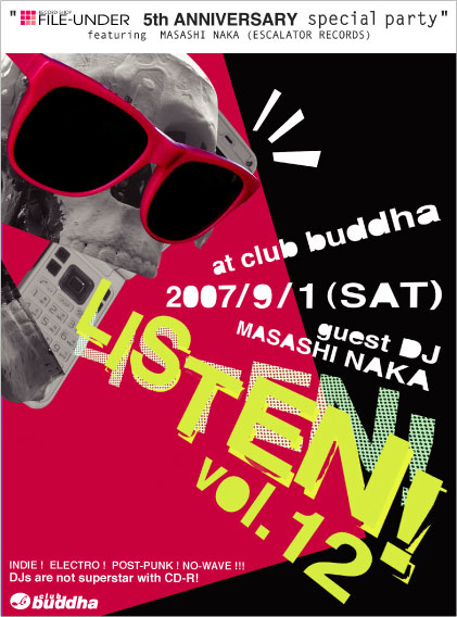 今年8月で、オープン5周年を迎えた名古屋/大須のセレクトレコードショップ " FILE-UNDER " がオーガナイズするレギュラーパーティ " LISTEN! " 、12回目&2周年となる今回は、ゲストにエスカレーターレコーズ代表、仲真史氏をゲストにフィーチャーしてお届けいたします!レギュラーDJ陣による、インディ〜エレクトロ〜ポストパンクなど今後要注目のニューカマーも交えたプレイと、レーベルのみならず、SHOP ESCALATORのオーナーとしても、常にアンダーグラウンドインディシーンを刺激、牽引し続ける仲氏のボーダレスなプレイがミックス、現在進行形のインディシーンをリアルに体感できるCOOLな一夜になること必至です!今回も恒例の、要CHECK! な新人バンドをたっぷり詰め込んだセレクトCDRを先着でプレゼントいたします。