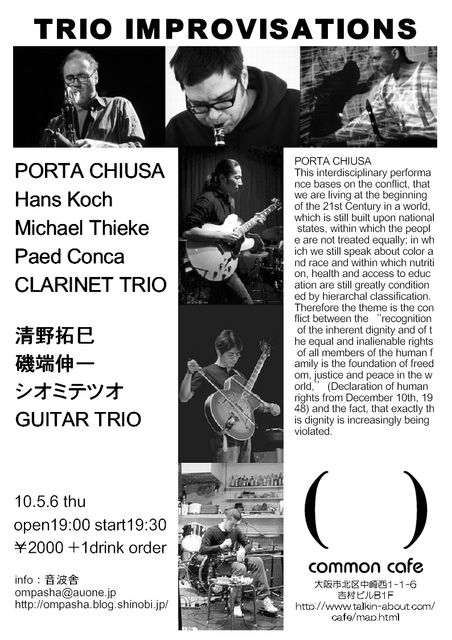 スイスから来日中のクラリネットトリオによるアンサンブルと、それぞれ関西在住でありながら普段の活動では絶対に共演は有り得ないであろう組み合わせのギタートリオによるライブです。ぜひお見逃しなく!