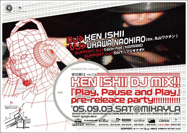 宇川祭り vol.03 KEN ISHII DJ MIX『Play, Pause and Play』pre-release party 2005.09.03(SAT) 22:00 START at.MIKAYLA(高松市サンポート8-40) ADV:3,000yen(w/1d) / DOOR:3,500yen(w/1d) DJ : Ken Ishii SUPPORT DJ : tack-hot / KAMANO VJ : 宇川直宏 SUPPORT VJ : Sort / ツジタナオト LAWSON TICKET : Lコード[67887] INFO : 087.811.5357 (MIKAYLA)