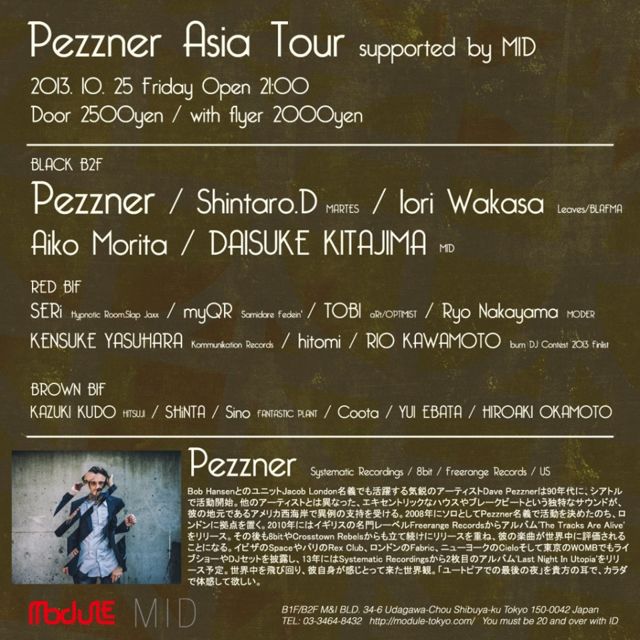 Ovum, OM, 8bit 等の名門レーベルからリリースを重ね、地元アメリカ、ヨーロッパで活動する Pezzner。今回は Asis Tour としての来日だが、日本では東京 module のみのギグとなる。ディスコ、ハウス、テクノ 様々なエッセンスを取り入れ唯一無二のサウンドは必聴。Pezzner がリミキサーを担当した MIND PIANO EP をリリースし、国内外で活躍する Iori Wakasa 等の東京を中心のアーティストが名を連ねる。