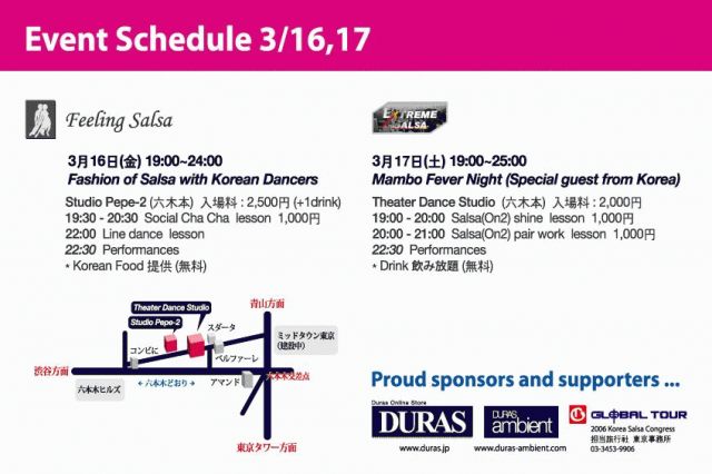 3月16日(金) 19:00〜24:00 Fashion of Salsa with korean dancers Studio Pepe-2 (六本木) 入場料:2,500円 (+1drink) 19:30 - 20:30 Social Cha Cha lesson 1,000円 22:00 Line dance lesson 22:30 Performances * Korean Food 提供 (無料)