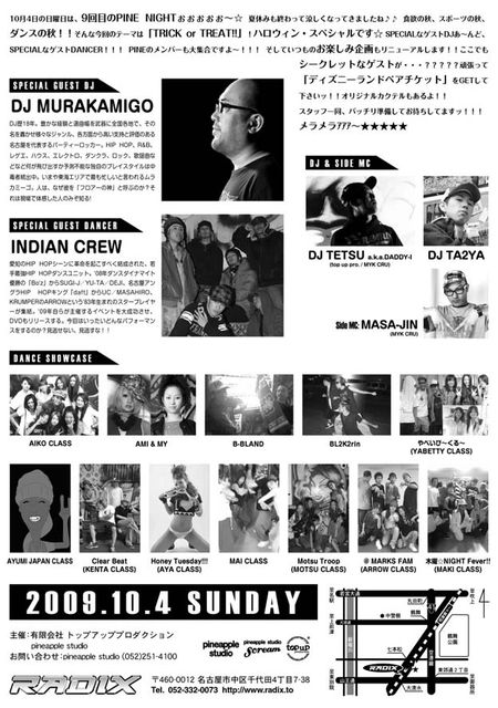 top up production & pineapple studio presents 「PINE NIGHT vol.9 〜TRICK or TREAT!!〜」 2009.10.4(SUN) OPEN 17:00 / CLOSE 23:00 ADV.2000yen / DOOR 2500yen ※入場時に別途1ドリンク代¥600必要