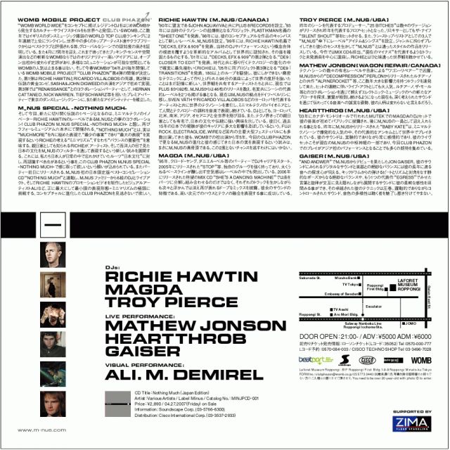 そして今回、切り開く新たな伝説の1ページとなるのは、ミニマルテクノのイノベーターRICHIE HAWTINのレーベルであるM_NUSとのコラボレーション CLUB PHAZON M_NUS SPECIAL - NOTHING MUCH - 。"NOTHING MUCH"とは、実は"MUCH MORE"を内に秘めた表現で、"最少の事案"でありながら"最大の表現"というRICHIE HAWTINの考える”ミニマリズム”、すなわち”バランスの重要性”を意味している。親日家としても知られるRICHIE HAWTINが、アーティスト、そして西洋人の目から見た日本の文化をM_NUSのフィルターを通して表現するという新しい試みを展開し、私たち日本人の日常の中で再認識すべく点があるという事をこのCLUB PHAZON M_NUS SPECIAL - NOTHING MUCH -で感じ取って欲しいとの願いが込められている。またパーティー前日にリリースされる、M_NUS初の日本限定版ベスト・コンピレーションCD"NOTHING MUCH"と連動し、M_NUSファミリーから6組のDJとライブアクト。そしてRICHIE HAWTINのプロモーションビデオを制作したビジュアルアーティストALIなど、正に最大にして最小限の表現形態=ミニマリズムの極限に挑戦する。コンセプチャルに進化したCLUB PHAZONを見逃さないで欲しい。