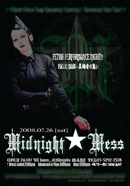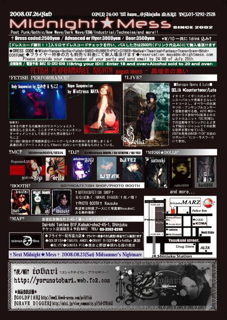 ■NEXT■ August 23 Midsummer's Nightmare @Shinjuku MARZ [CAST] TBA,,, ■ 2008 Midnight★Mess SCHEDULE■ September 27 "6th ANNIVERSARY!!" October 25 "XXX NIGHTMARE" November 22 "VAMPIRE BALL" December 27 Nightmare before X's mass ▶Midnight★Mess HP http://midnightmess.com ▶MYSPACE http://www.myspace.com/messdoll