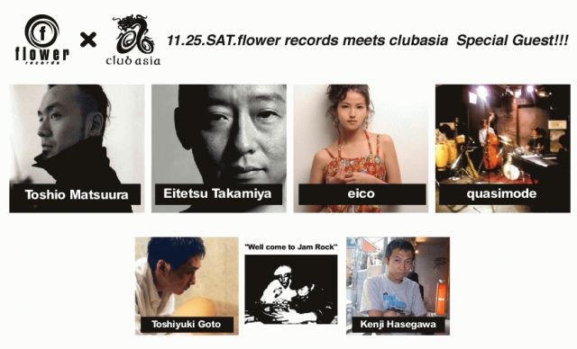 渋谷 club asia OPEN/START 23:00 DJ Main Floor:Masato Komatsu(Slowly), 松浦俊夫, 高宮永徹 Live:quasumode, eico 2nd floor "Welcome to Jam Rock":Toshiyuki Goto, Kenji Hasegawa 1st lounge:masao a.k.a. oldfashon, 中島正登(bloc), 石井彩香, showgo