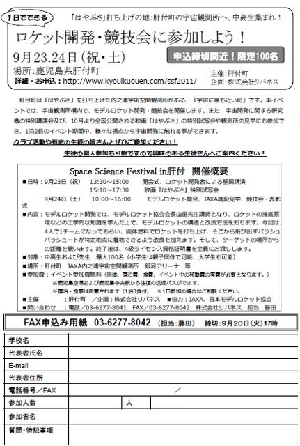 -----------------------------------------------------------------------------------------------------> Space Science Festival in 肝付〜宇宙に一番近い町で宇宙をフル体験〜 ★子どもたちを対象とした初のモデルロケット競技会 ★20世紀FOX映画「はやぶさ」特別試写会 ★詳細・申込み:http://goo.gl/eUHJ0 ----------------------------------------------------------------------------------------------------->